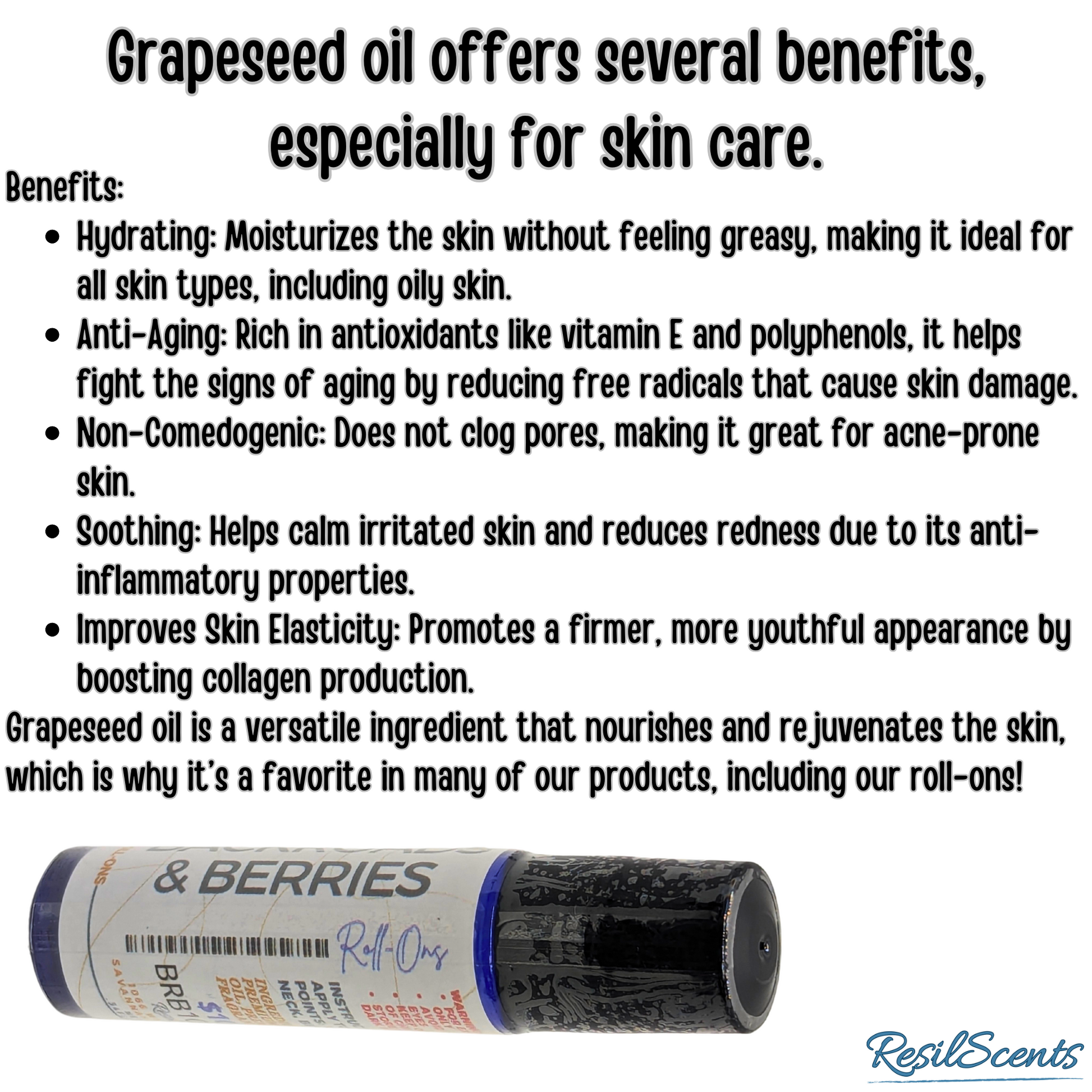 Skin-safe grapeseed oil base absorbs smoothly and keeps scent close without irritation.